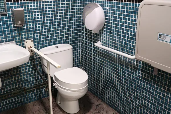 ● El inodoro tiene barras de apoyo a ambos lados: una abatible y una fija.
