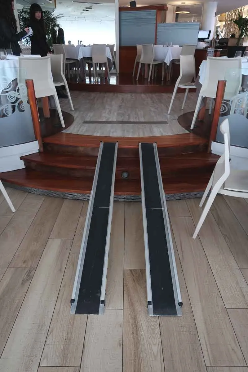 ● En el bar y en el restaurante hay zonas con escalones, las personas usuarias de silla de ruedas deben solicitar las rampas móviles para acceder a dichas áreas.