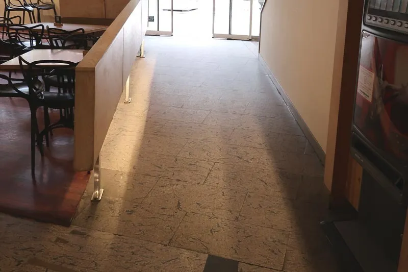 ● Hay una rampa entre el acceso principal y el bar/cafetería con una zona libre de paso de 150 cm de ancho y un desnivel del 8%.