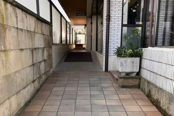 ● Hoteletik, hotelera sartzeko arrapala igo eta ate automatiko lerragarri bat gurutzatuta.