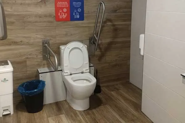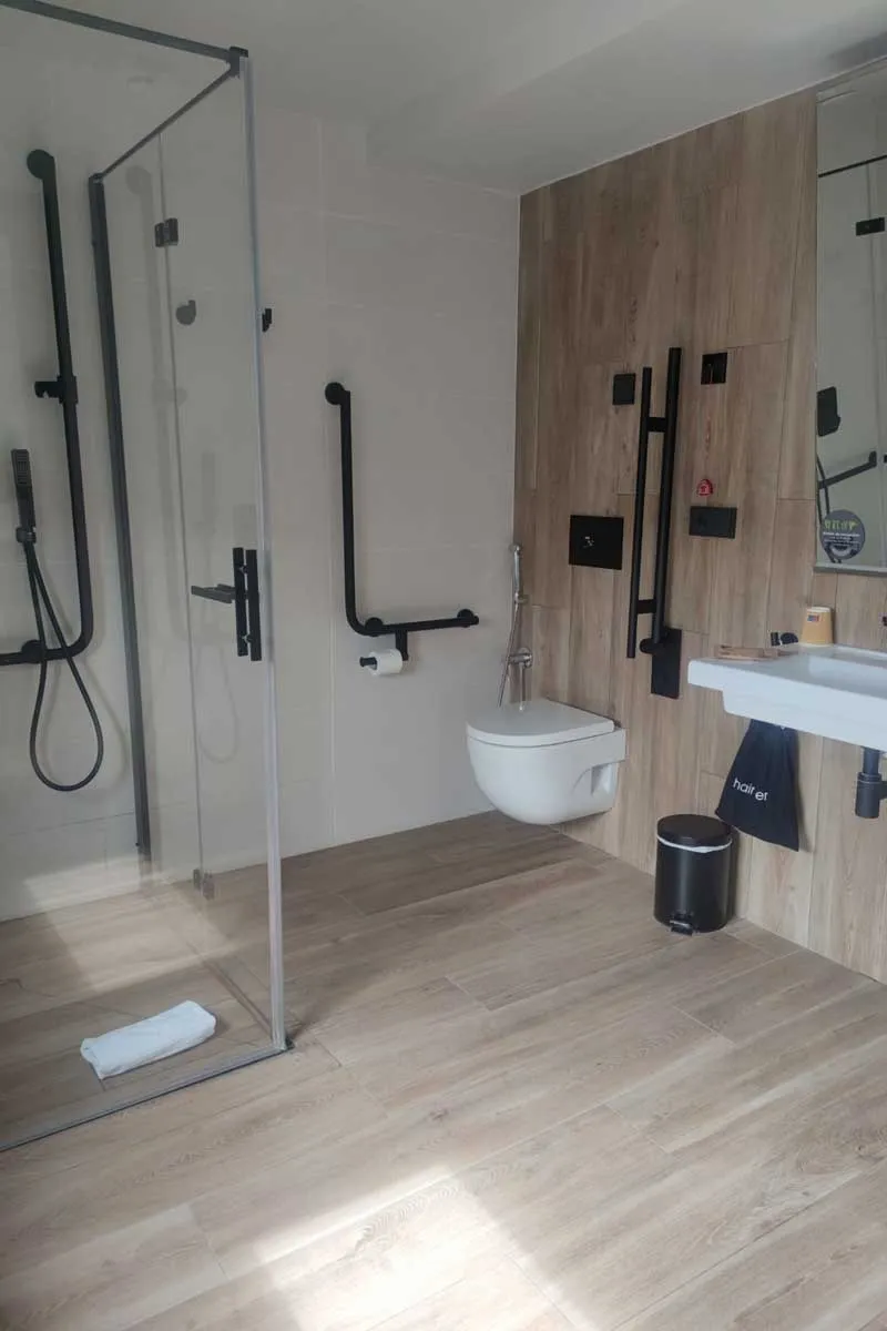 ● Logelako bainugela handia da, eta 80 cm-ko zabalerako igarobide libreko eremua duen ate lerragarria du. Dutxa-platera zoruaren mailan dago eta laguntzako barrak ditu. Konketak hurbiltzeko moduko tokia dauka eta txorrota irisgarria da. Komunak eusteko bi barra ditu, bata eraisgarria eta bestea finkoa.