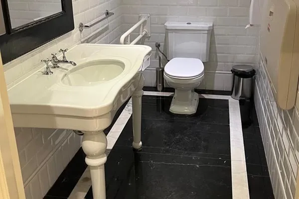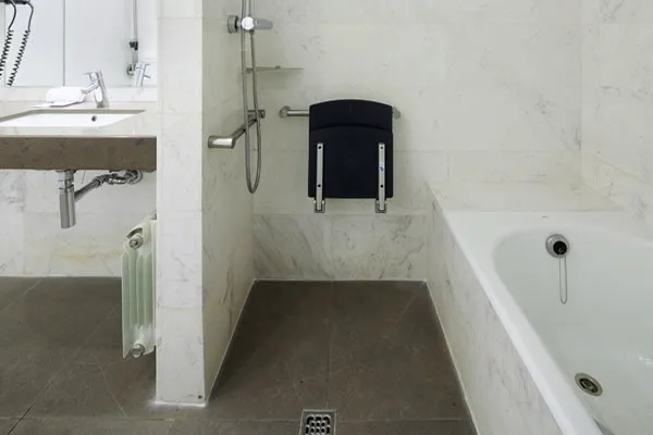 ● 5 logeletako komuna zabala da: ateak lerragarriak dira, dutxak zero kotan daude eta eserlekuak eta euskarri-barrak dituzte eta bainuontziak ere badaude. Konketak aginte bakarreko iturria dauka eta gurpil-aulkian doazen pertsonak hurbiltzeko egokituta dago. Gainera, komunontziak euskarri-barrak ditu bi aldeetan.