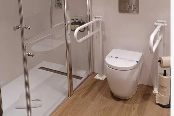 ● Guztientzako komun bat, “egokitu” seinalea duena. Kontuz! Komuna txikia da; komunontziak ez du laguntzeko barrarik; atea barrurantz irekitzen da eta kabinaren barruan ezinezkoa da gurpil aulkia biratzea.