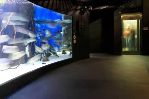 Este emblemático edificio, construido en 1928, está distribuido en 3 plantas. En la planta 0, se encuentran la recepción taquillas, una zona de consignas y la tienda de souvenirs. La segunda y primera están dedicadas al patrimonio marítimo y marino de Gipuzkoa, destacando el esqueleto de una ballena franca, así­ como una amplia oferta de acuarios dedicados al mar Cantábrico, en los que podrás contemplar más de 200 especies, con su famoso túnel de 360º, a lo que hay que sumar una amplia variedad de especies tropicales.