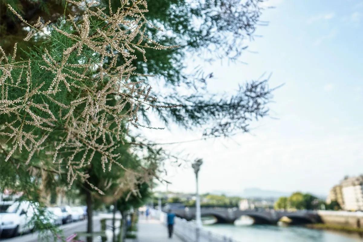 Remontamos el río siguiendo su curso junto a él. Seguimos por la calle Ramón María Lili. Nos fijamos en los árboles de este paseo al borde del Urumea, que seguramente se nos harán familiares.